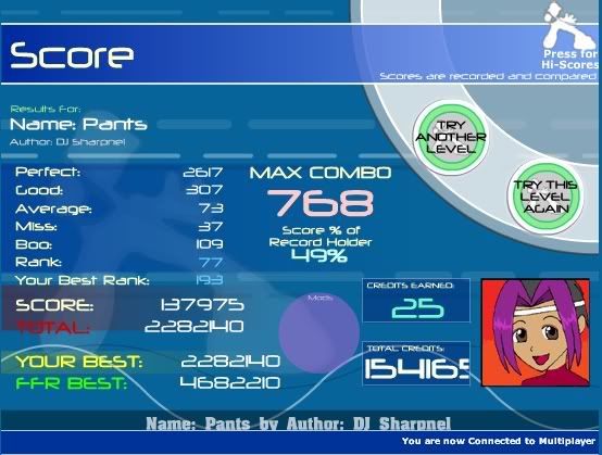 edit just got 332 combo, the hardest part is the slow part where it isn't just a constant stream of arrows because you have no basis for where the left,down,up, or right arrows should be compared to the other arrows in the stream EDIT LOL video http://www.flashflashrevolution.com/...14#post1028414