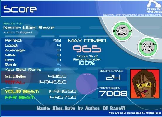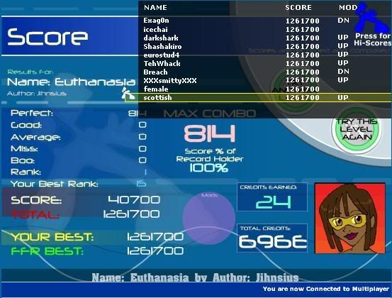 I missed the triple jack of L-R arrows, just once. FREAK! EDIT: Nevermind, I got it! Edit 2: A kiler TGWP5 score, imo. I can't believe I almost FC'd it... ![]() ![]() Last edited by eagleboy; 12-13-2006 at 09:29 AM.. |