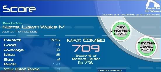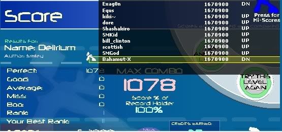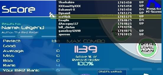 1 Love You Anymore 186,000 1 Trip to the Moon (Club Remix) 221,650 1 Halcyon 232,500 1 Dance 2 This 249,550 1 SuperMario 8bit Eighties Remix 269,700 1 This Beat is For Tha Streets! 280,550 1 Computer Dreams 288,300 1 She Bangs (William Hung Version) 291,400 1 Contra- distinction 475,850 1 Spontaneous Hydroxide 492,900 1 Come With Me 497,550 1 Below The Surface 514,600 1 Secret Zombie Room 568,850 1 Start Something 570,400 1 8-Bit Day Dreamer 576,600 1 La Luna Caida 578,150 1 Blank Knowing 602,950 1 Snowflakes 606,050 1 Life Goes On 615,350 1 Platypus 638,600 1 RainDrops 720,750 1 Go Go Go Power Rangers 826,150 1 Noir Remixed 858,700 1 Horizon 888,150 Also got this, never could get below 20 for some reason.. I felt myself get at least 5 or 6 goods near the end at the stream my hands are too cold to keep playing