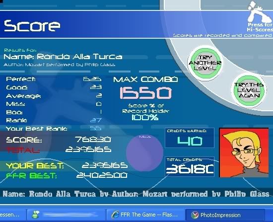 11 11 Balloon Fever 1,502,320 11 9 Rondo Alla Turca 2,399,530 12 10 Nova Pulser 1,176,000 13 9 Force Of Light 1,663,930 13 10 The Games We Played, Part 1 1,837,740 15 12 Pants 3,505,985 16 10 For FFR 1,338,725 16 11 Exciting Hyper Highspeed Star 2,057,480 18 9 Abtrusity 1,111,525 19 9 Chrono Trigger - Boss Theme 653,795 20 11 AIM Anthem 1,056,655 21 8 Lethal Injection 1,660,575 23 10 Gradeus 2,331,390 28 12 Crowdpleaser 1,146,770 536Average: 2.5046728971963update also got my first fc on aim rofl, 200+ goods, thats gonna be a hard one to improve on. Last edited by darkshark; 03-29-2007 at 11:33 PM.. |