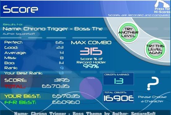 I like Tass's use of wordage. Chronown'd. That's amusing. Oh, and after too many tries I got a disappointing 2-1-1-1 on HD7 -_- ALL at the very end jumpy stuff crap. 504 combo. Last edited by smartdude1212; 04-25-2007 at 06:28 PM.. |