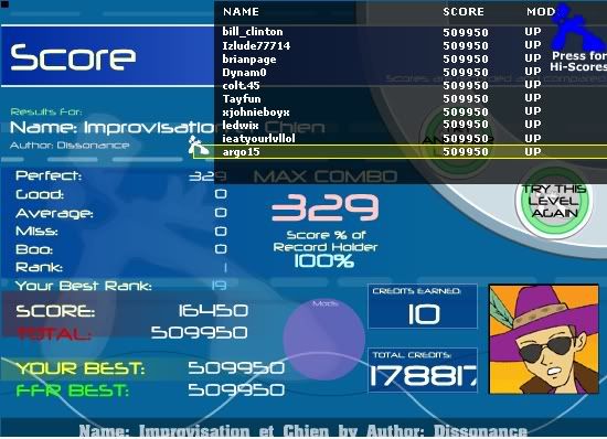 41 8 NeoMAX 1,087,275 41 10 Jelly Roll Blues 1,188,080 41 7 Synesthetic FFR Edit 1,190,850 41 8 Euthanasia 1,261,150 41 9 Hyper Pressure 1,721,775 41 11 Strangeprogram 1,921,415 Rofl, 7 ranked 41, and I also have 5 ranked 71. |