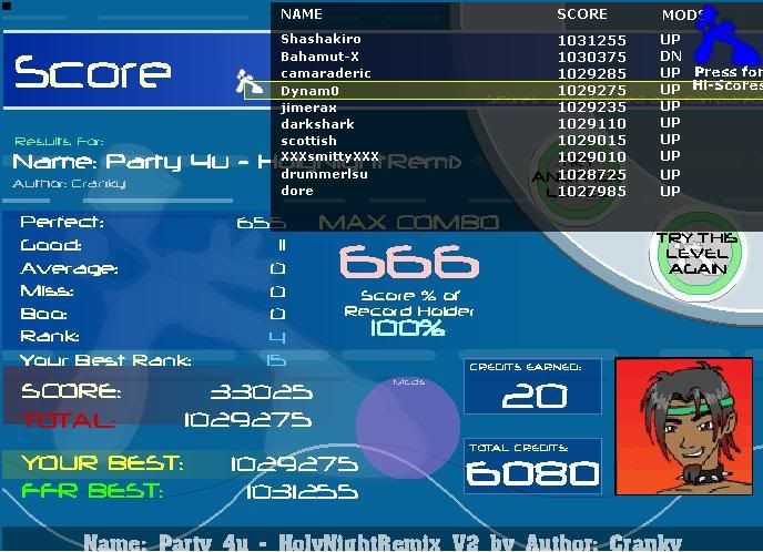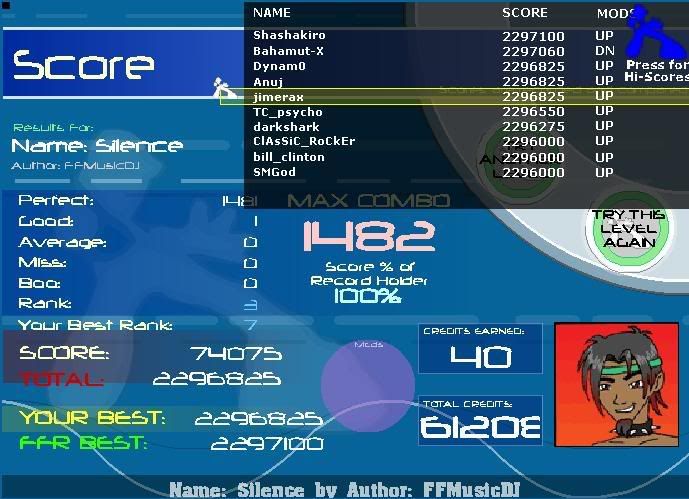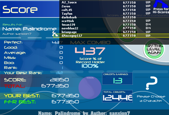 #115 ![]() Edit: #116, I got to the end of this song 3 times with autofail on, but couldn't get an AAA. I got a good on the very last jump twice, and another time, I hit the last jump perfectly, but wtf missed on the yellow arrow before it. ![]() Another edit: #117 Always seem to mess up right before the trills, but first time I got past the trills, I got the AAA. ![]()