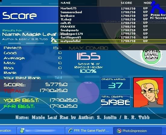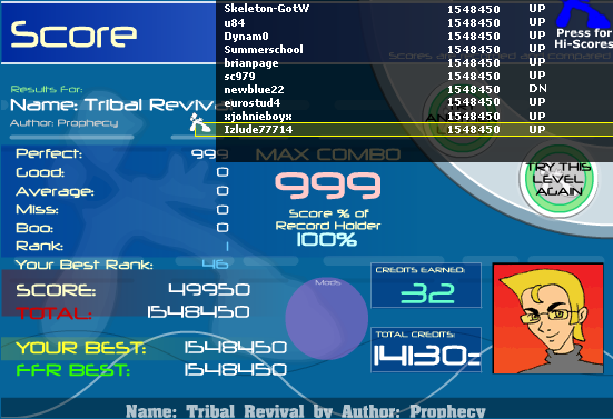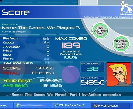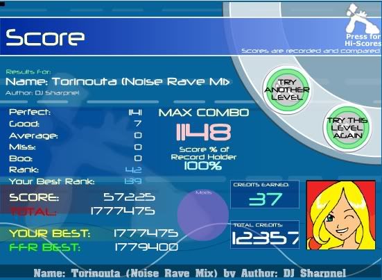 Today I found out that Playdoh wasn't so hard after all: ![]() I hardly ever played TGWP because of it's length, but I decided to give it a go. With this score, I was most surprised that I didn't trip up any boos or averages (TGWP part 1): ![]() N.B. The 4 right-arrow jacks around 800 combo can screw over. Oh, and +5 tps. ![]() Last edited by bmah; 05-24-2007 at 08:18 PM.. |