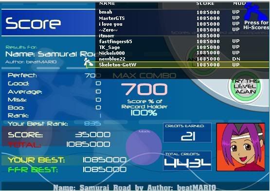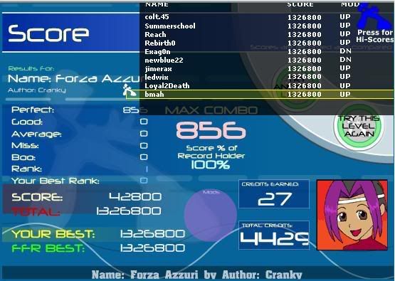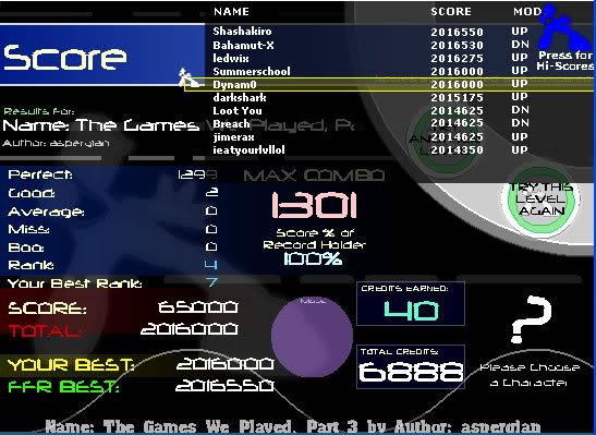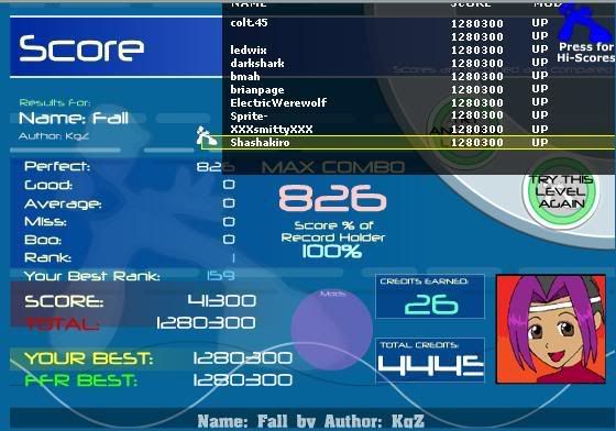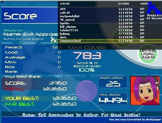 http://www.flashflashrevolution.com/...gameid=5091044 Not bad for a guy who uses a wireless POS keyboard huh? BTW that lawn wake, I got IMed at the end when I had my combo going...it would have probably been closer to 500 ![]() |