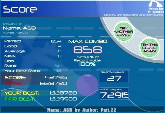 AAA'd Seven up to the last 6 arrows and it was that 48-8-28 part and the arrows just disappeared on me. No lag spike, autofail not on, just disappeared. ****ing pissed me off. The entire screen just went black on me. WHAT THE ****. Edit: I'll take it. Improvement from 3. ![]() 5316Average: 22.15update Terminating decimals ++ And this is with all those random hacked scores, like 30 pts worth rofl. Edit2: This works too. ![]() Got one bs good on easy 4th stuff in TfB near the end so I quit trying that one. Won't bother with SSSG for tonight. Last edited by smartdude1212; 05-31-2007 at 10:53 PM.. |