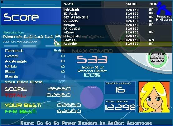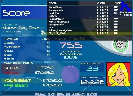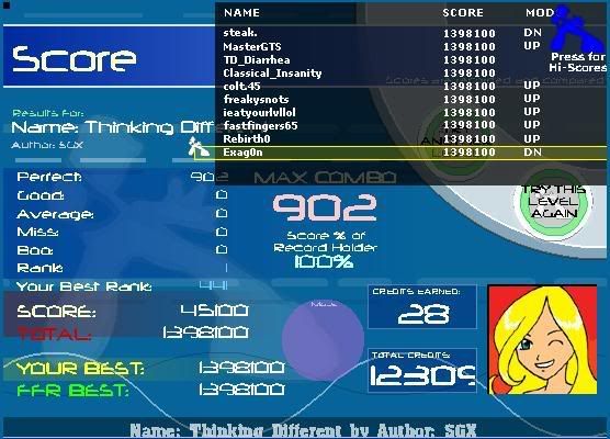 _____________________________________________ AAA - 189 Level rank Average Level - ? Best legit. FC - Runnymorning (SGX Mix) ITG Overall % - 97.60(not updating anymore) ___________________________________ Winner of HammyMcSquirrel's tournament Winner of rshadow8888's tournament Winner of travman301's tournament Winner of Colt.45's tournament |