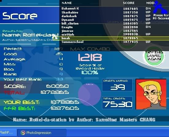 Highest Combo-3330 (Full Combo Blue Army)[10/12][Level 67] Highest Score-5,103,380 (Blue Army) Highest Level AAA-Heroes On Your Lawn At Night [9/12][Level 53] Highest Level FC-Choprite [11/12][70] (1796c) Highest Level Clear-Undici [13/12][Level 110] AAAs-509 (445+64) Tier Points-151 Very Challenging Full Combos-89+ Overall Average Rank Before AvMissFix-556 (AAA:126)(FC:367) Standard Difficulty AAAs-57+ Tricky Difficulty AAAs-74+ Difficult AAAs-107+ Very Difficult AAAs-48+ Steppingest AAA-1442 (Bicycle Break)[7/12] Last edited by MI4 REAL; 06-13-2007 at 11:20 PM.. |