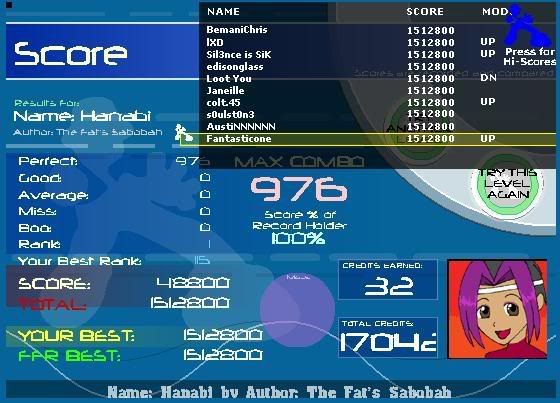 (8)- AAA (1,140,800) (7)- Single Digit Good (1,138,325) (6)- 40 or fewer (1,129,800) (5)- 80 or fewer (1,118,800) (4)- Full Combo (1,095,170) My FC: 1,088,495 Not even close. XD |