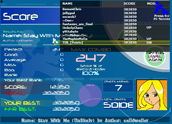 And of all the scores I got, Skellybones was the only that didn't record. EDIT: Actually, no, I forgot. Activity Unbroken didn't record either, so I did it again, and AAA'd it 2 out of 2 times. Last edited by Pobeli; 06-26-2007 at 09:27 PM.. Reason: I am stupid hehe I messed up |