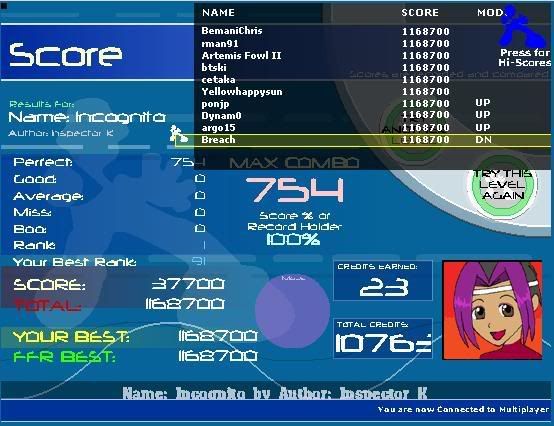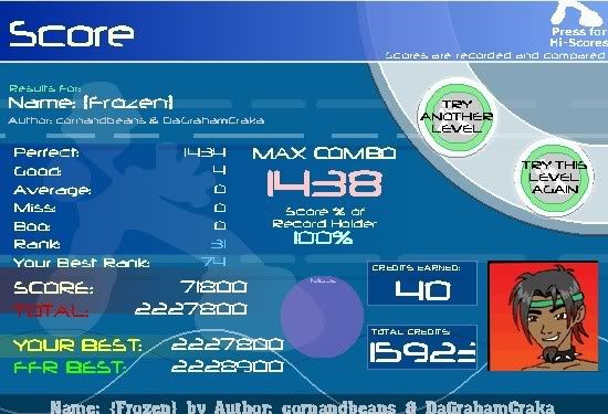 ![]() Edit: Why the **** do both my difficulty 11 AAA screenshots have ****ing hacked/glitched higher scores?! FotBB had 2, and now Hellbeat has 1. Oh well, I guess I should just be glad I AAA'd. =DDD Last edited by smartdude1212; 06-27-2007 at 06:47 PM.. |