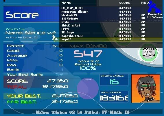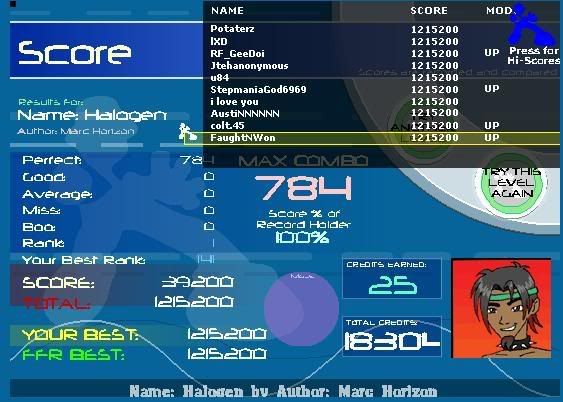 No clue why that took me so long ![]() GAH this song was a huge pain in the ass, hate that background ![]() I like this version a lot better ![]() Last but not least, stupid beeps and **** for 3 minutes, die ![]() Got 2 goods on Z and 4 on NNN but didn't take screenshots cause I thought I could AAA them lol. Eventually, hopefully |