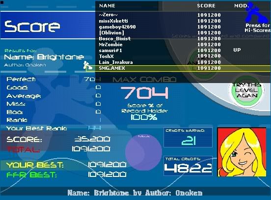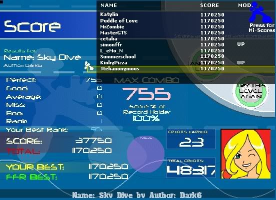 ![]() Just started to play my skill tokens! ^_^ EDIT: Got this right after...first sightread AAA ever i think... ![]() EDIT2: K this was easy but I got these 3 in a row, that's what makes it cool! ![]() Holy sh** that was a great song...i never thought i'd see an ambient song stepped, but that was wicked awesome!