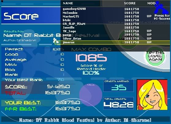 ![]() Evil blackflags, EVIL I tried the new song even though I probably shouldn't have It was fun, could have fc'ed with I think it was 12 goods but I bombed it, don't really feel like playing it again. |