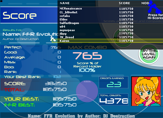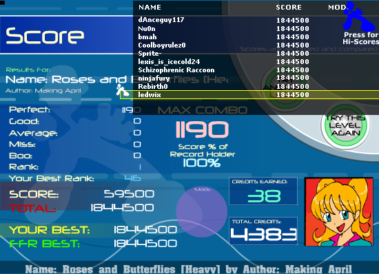 ![]() This pretty much the only hard AAA I got. ![]() Why didn't I have a AAA on this? Oh, and lol hacker. ![]() Wheeee!!!1! ![]() Black Flagged it when it first came out, didn't want to play again due to length. ![]() Easy Synthlight file. ![]() Dang, I just love this song. I've kinda lost rack of my AAA's... but I know these give me 140 public AAA's. brb, AAA'ing Crystalis, because that's about the only Synthlight file left other then Shag... which I really don't ever want to play again, because the song is terrible. |