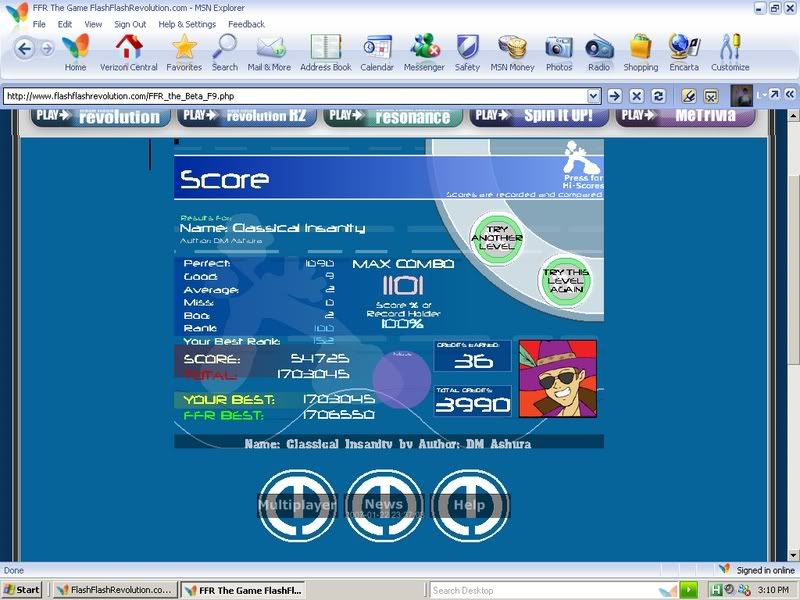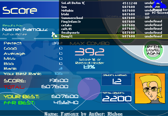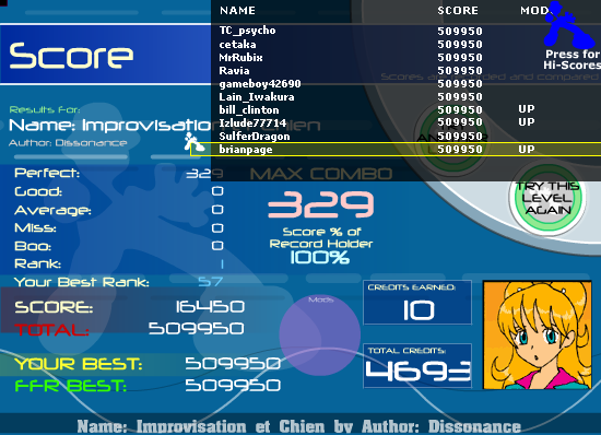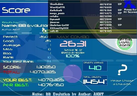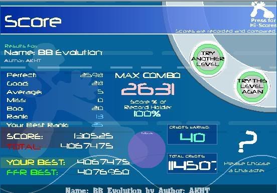 some scores i got earlier that i didn't ss 5-0-0-1 on KK 5 goods on splash beats 12 goods on JRB BF on hungarian dance #7 2 goods on classical insanity 18 goods on silence Average is now: 9.37 and my ranks i really need to get down =< LOL at crystalis 101 12 RunnyMorning (SGX MIX) 1,165,240 108 6 Crystalis - House Leaves (Remix) 435,995 119 12 Grand Gallop Chromatique 1,492,485 126 12 Revolutionary Etude 1,317,425 210 11 Flight of the Bumblebee 932,850 278 12 Pants 2,172,175 |