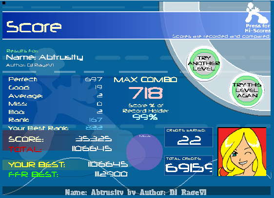 Highest Combo-3330 (Full Combo Blue Army)[10/12][Level 67] Highest Score-5,103,380 (Blue Army) Highest Level AAA-Heroes On Your Lawn At Night [9/12][Level 53] Highest Level FC-Choprite [11/12][70] (1796c) Highest Level Clear-Undici [13/12][Level 110] AAAs-509 (445+64) Tier Points-151 Very Challenging Full Combos-89+ Overall Average Rank Before AvMissFix-556 (AAA:126)(FC:367) Standard Difficulty AAAs-57+ Tricky Difficulty AAAs-74+ Difficult AAAs-107+ Very Difficult AAAs-48+ Steppingest AAA-1442 (Bicycle Break)[7/12] |