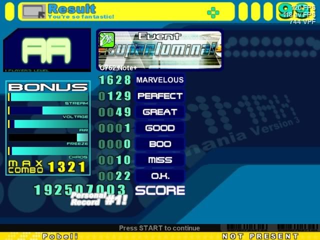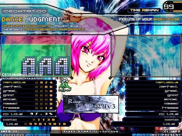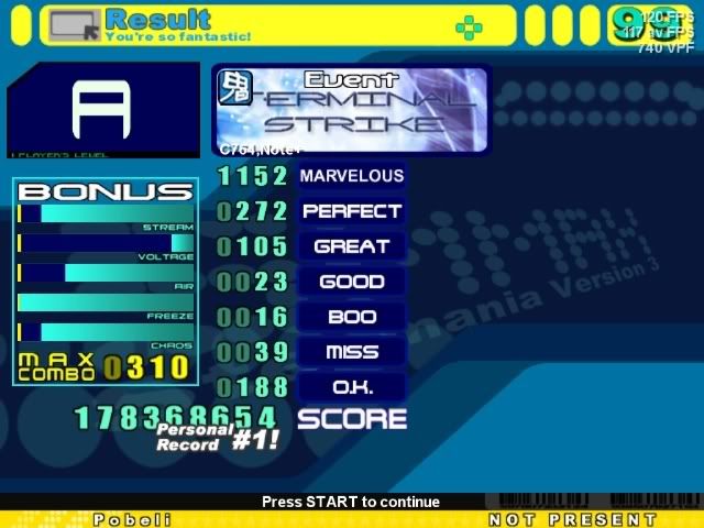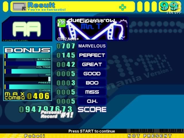 Tonight I blackflagged Azul about 20 notes from the end and FC SDG'd Zen v2. Also I got 16 perfects on Rose oni but hit a mine. I think I could possibly SDP it though. Nice AA for me with my jackhammer skills. ![]() EDIT: For some reason the screenshot isn't showing up right now. It's Due Tomorrow. Last edited by Pobeli; 08-7-2007 at 10:24 PM.. |