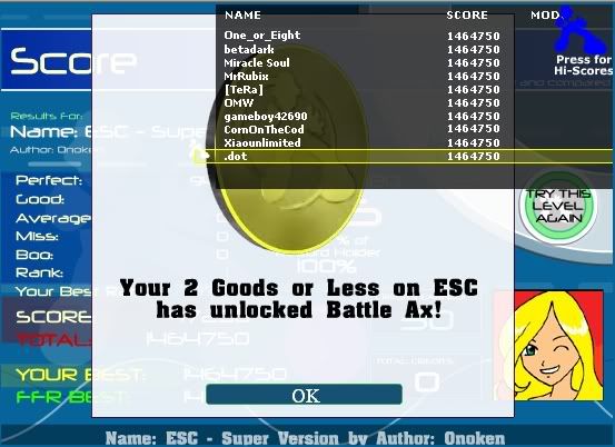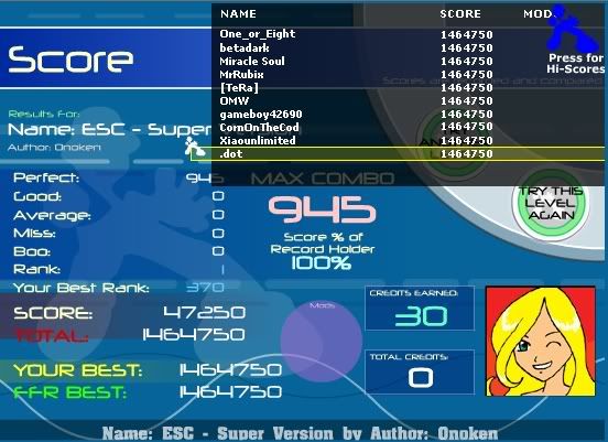 Indeed...Etc. Best Non-AAA Ranks (Before AvMiss Was Fixed): Choprite, Rank 6 [3-0-0-0]; TGWP Part 1, Rank 11 [5-0-0-0]; Otaku Speedvibe Heavy, Rank 13 [1-0-0-0]; Blue Army, Rank 5 [1-0-0-0] Last edited by SoultakerNFH; 08-16-2007 at 12:43 AM.. Reason: Woot ^^! |