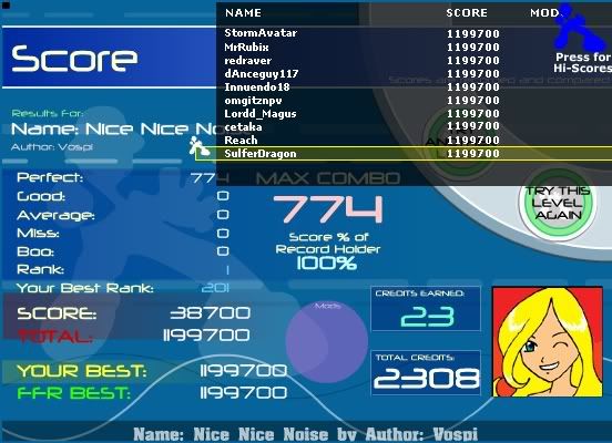 I really wish I could FC BB Revenge, I'm getting rly gud PA (for me) in the 25-40 good range, and only 5-7 avmisses. I can get 700 combo from the very beginning, miss randomly somewhere because I kinda get lost, get another 880, miss the 3-framer, and then conquer the rest. With, of course, random avmisses and stuff. Last edited by smartdude1212; 08-15-2007 at 05:38 PM.. |
