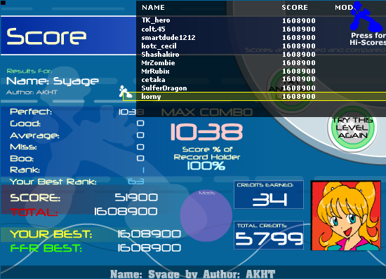 ![]() k ![]() easy. bf'd it first try though. EDIT: I just noticed that the max combo on both of these is the same. Last edited by SulferDragon; 08-19-2007 at 04:12 PM.. Reason: 980 |