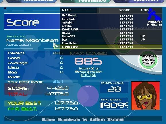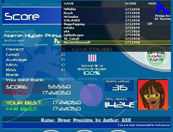 _____________________________________________ AAA - 189 Level rank Average Level - ? Best legit. FC - Runnymorning (SGX Mix) ITG Overall % - 97.60(not updating anymore) ___________________________________ Winner of HammyMcSquirrel's tournament Winner of rshadow8888's tournament Winner of travman301's tournament Winner of Colt.45's tournament |