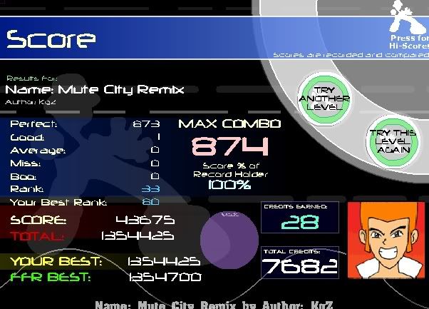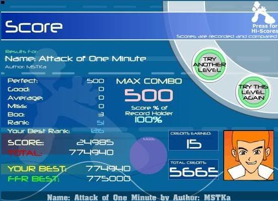 well here's your AAAs ![]() yay unrecorded scores ^_^ [#51] ![]() i like the steps ver much [#52] ![]() yay a run without av misses [#53] ![]() i cant tell you how many times i got 0-1-1-1, 0-2-2-2, 1-1-1-1 [#54] ![]() for the tournament, but a AAA non the less [#55] |