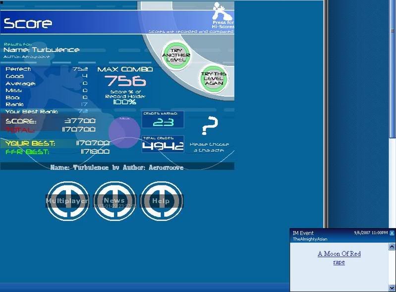 ![]() >.< One try for the tourney... Apparently, my PA has greatly improved after playing SM for about 5 days... Almost got a 0-boo FC of the etude jumpstream in 1 try... I'll probably go for the AAA on one last battle though.. I really need to get in round 2 :-/