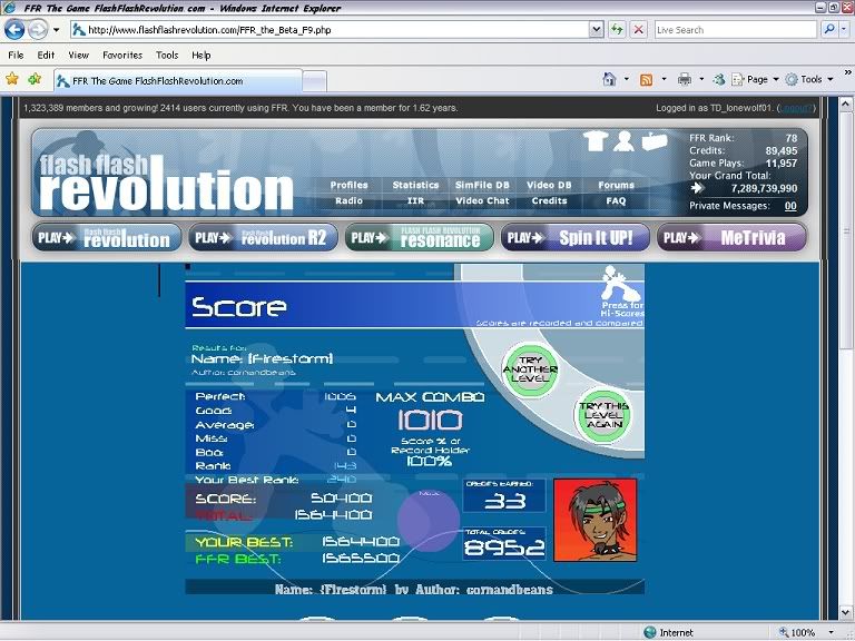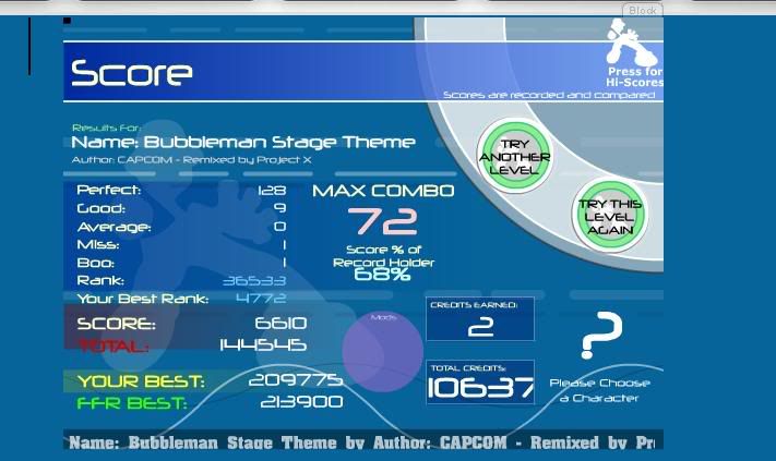 ![]() [My Profile] | [My Music] | [Play FFR] | [My Photobucket] | [My DeviantArt] AAAs: 210 (186+7+17) Best AAAs: Vertex BETA, Fighting for Control, Nova Pulser Recent AAAs: {Firestorm}, Dazzling Destiny, Hellbeat v2p 2nd place in 3rd Official Tournament 1st place in Jugglin/Jteh's 1st Tournament |