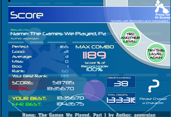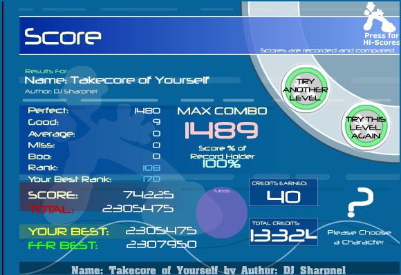 Indeed...Etc. Best Non-AAA Ranks (Before AvMiss Was Fixed): Choprite, Rank 6 [3-0-0-0]; TGWP Part 1, Rank 11 [5-0-0-0]; Otaku Speedvibe Heavy, Rank 13 [1-0-0-0]; Blue Army, Rank 5 [1-0-0-0] Last edited by SoultakerNFH; 10-1-2007 at 02:26 PM.. Reason: Nevermind, Slinkyyy fix'd it |
