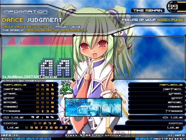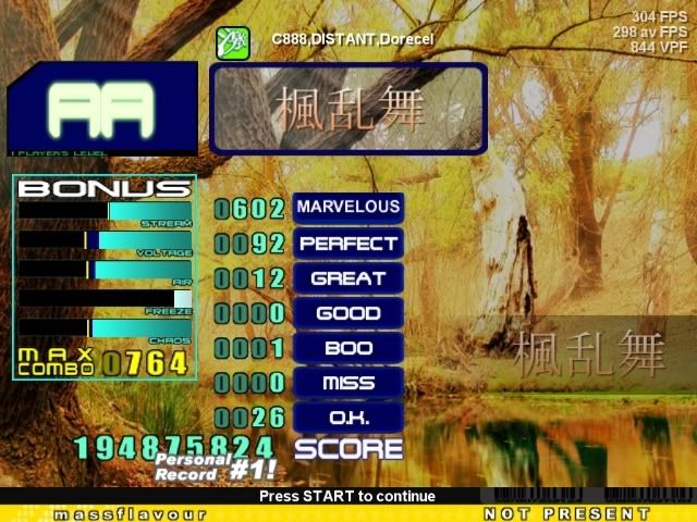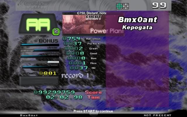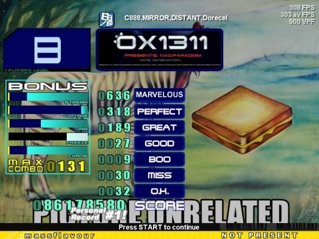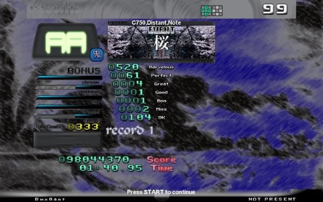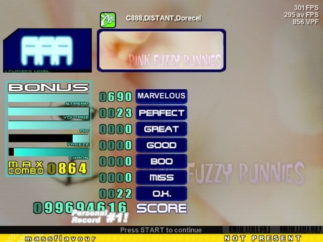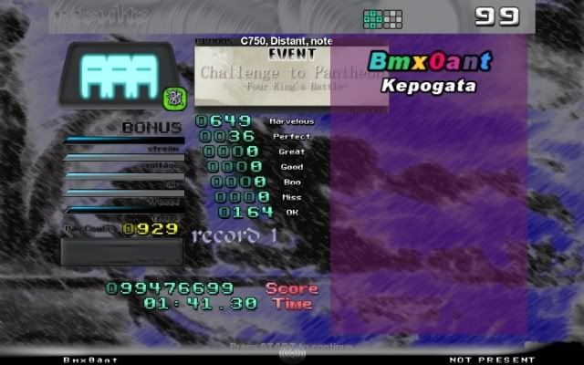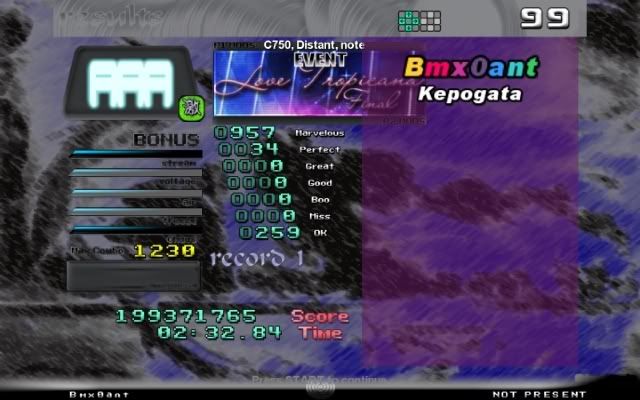 ![]() lol xmod song ![]() I think this is improved from like 30 perfs. ![]() A pretty good sightread. ![]() Damnit. ![]() Messed up the very last arrow. ![]() Can FC maybe even AAA with some good practice.