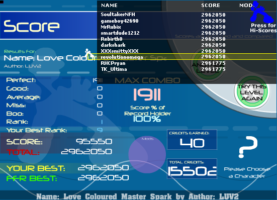 Been starting to play runny a lot for the tiebreaker, this is my best so far: ![]() And I don't care if that PA/boo count sucks since I got a good combo for me. I was so nervous I was just hitting the trills around 630-780 or so as if they were all jumps to make sure I kept my combo lol. Edit: woah, triple ninja'd, nice scores all.