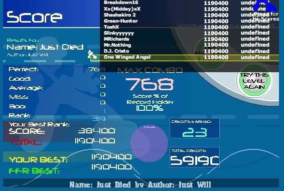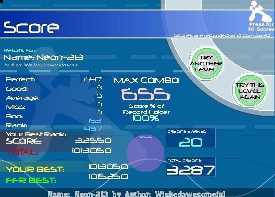 ![]() Blah... ![]() Didn't record =/ ...I later got 6 Goods and figured that was good enough. ![]() Rank jump. Yes, I mashed in some spots. Honestly, the jacks are the easy part of this, it's the jumpstreams I suck at. |