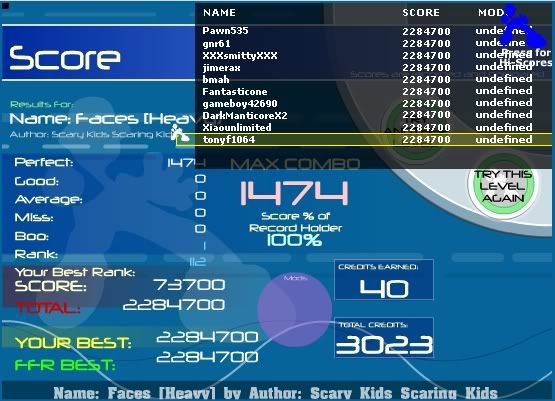 ![]() Not worthy amongst the last couple of scores in this thread, but I use to whore this song so much trying to get an FC. I still cant belive I AAA'd it, as lame as it is.