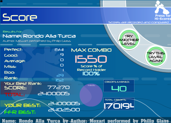 Rondo Alla Turca SDG. Not too bad, but I know I should be getting 4 goods and under because I can PFC up to the left hand trill jackhammer. After the left hand trill jackhammer I only get maybe 2 more goods total on other jackhammers. Had terrible PA in this run, 6 goods by the time I hit my 768th arrow.
