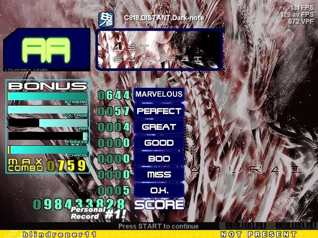 sightread... haha sooo many dumb misses. i started figurin out the patterns towards the end. ![]() this is annoying. i had a 1000+ combo, then i missed on some transition, and then i comboed 1200+. >< ![]() darn ![]() |