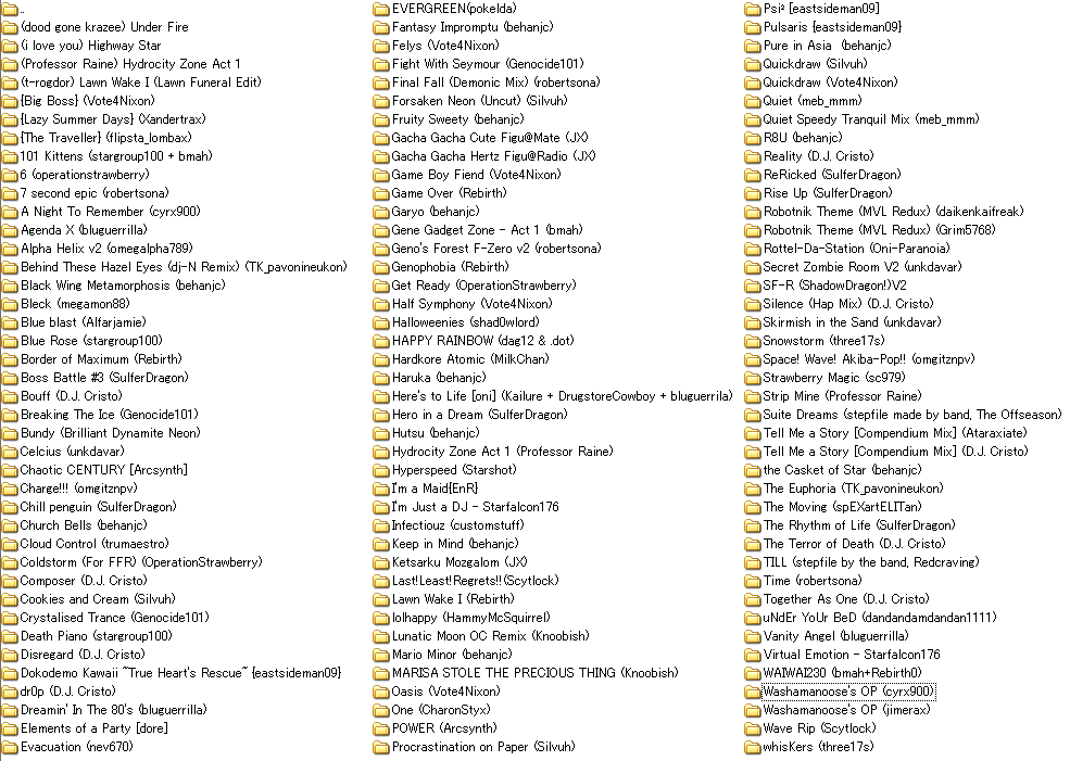 Anyways, to reply to your comments, I have no clue what 16th jack patterns you're specifically talking about...they're all over the file. The ones in the beginning (and where they repeat) follow the "half and half" THEME of the file, not to mention they're consistent with the ones used later on to match the triple drum taps in the song. The only other 16th jacks are the ones to the trumpet (again, they fit the music), and the ones on m28, which keeps the patterns I chose technically correct. Sure, I could change those but they make the file much more fun, and do no harm...and it's 90 BPM wtf man. Also, the green/orange note was from a comment rebirth made last time on the file, he wanted me to make that change. Quote: