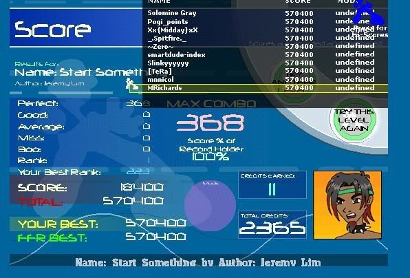 This made me go ' ' this used to be my arch-enemy for not letting me advance in 3rd FFR tourney.![]() And that score also gave me some goodie: ![]() Got 8-0-0-0 on the file so far, pretty tight stream. Then some Jurs OP AAAing and got this: ![]() 66-4-0-20 FC after a while. This isn't hard file but I get BS boos with autofail on, I don't get it, maybe I got minor lagspikes or something and long song to allow more of those too. ![]() |