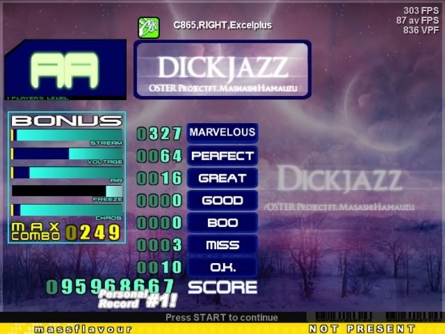 close to my score ![]() mai score was 2026 Marvelous 121 Perfect 25 Great 2 Good 4 Boo 4 Miss 9 OK 0 NG 0 Hit Mines 0 Avoided Mines Last edited by colt.45; 01-6-2008 at 10:17 PM.. |