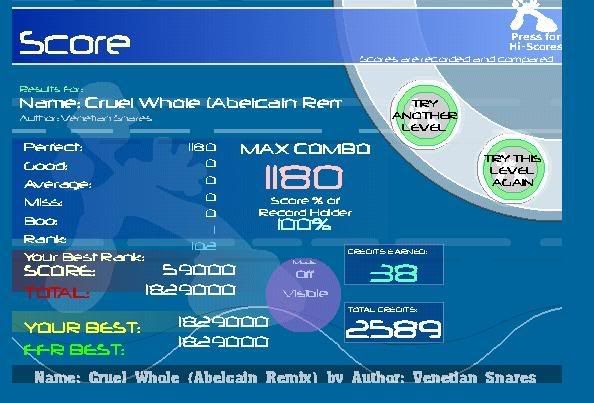 Ball of Malt http://www.flashflashrevolution.com/...play/10742804/ Build God, Then We'll Talk [Heavy] http://www.flashflashrevolution.com/...play/10766911/ Incognito http://www.flashflashrevolution.com/...play/10818963/ |