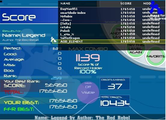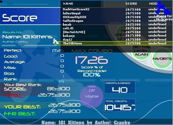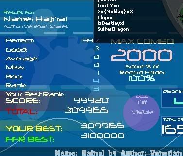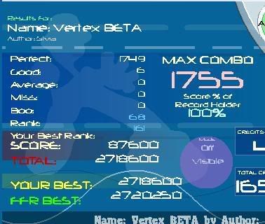 ![]() [My Profile] | [My Music] | [Play FFR] | [My Photobucket] | [My DeviantArt] AAAs: 210 (186+7+17) Best AAAs: Vertex BETA, Fighting for Control, Nova Pulser Recent AAAs: {Firestorm}, Dazzling Destiny, Hellbeat v2p 2nd place in 3rd Official Tournament 1st place in Jugglin/Jteh's 1st Tournament |