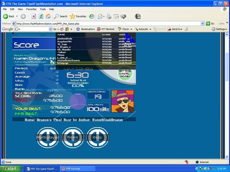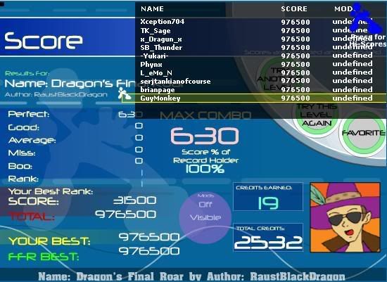 Removed a .gif image so your total signature size isn't well over 1MB. Keep this in mind for the future. 5th Official FFR Tournament Scores (Division 5) Round 1: Novo Mundo (AAA) Round 2: 4 Chord Touhou (AAA) Round 3: October (1.0.0.1) Round 4: Silly Symphony (1.0.0.0) Round 5: Hardkore Atomic (4.0.0.1) Round 6: Blue Rose (2.0.0.0) Round 7: La Dump (Eliminated for being lazy.) ![]() Quote: