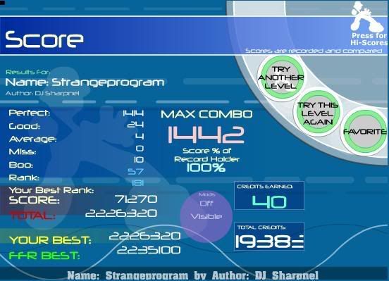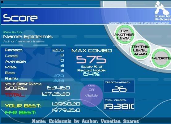 Celebrate your one year by giving out credits, lawl. So I haven't really played FFR for a couple of days, and downloaded SMO. It's been very fun, and have gotten very good. I decided to play FFR. ![]() First FC. Good? ![]() ![]() ![]() Repost. These are mainly just for PA, and were all first tries. *Hand just stopped in monstrous turtle btw, (misses)* Long post. |