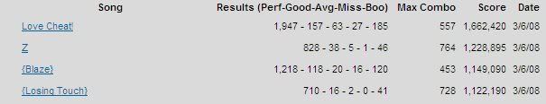 Token #whichever: * ![]() Silvuh: Hit all perfects on Ruins except for a miss on the last note. Unlocks: (Nothing at the moment. I'll think of something or create something or something or other... yeah...) Number of Unlocks: 0 And maybe I'll try "unlocking" some of these later. A bit late to now, though. P.S. All toke images should be 40 x 45 pixels, because that's the official size... maybe... Last edited by Silvuh; 03-6-2008 at 11:51 PM.. |