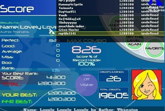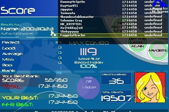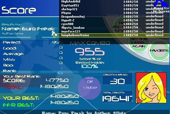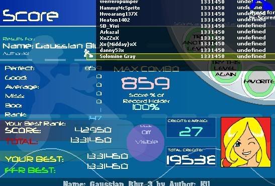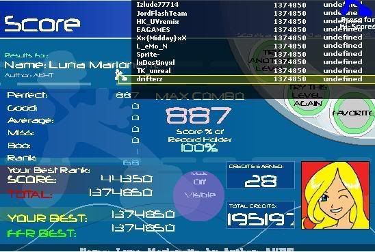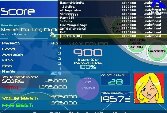 lol... nice score i love you, wow i cant pa to save my life after 2 weeks of sm... i figured it'd help but now 1.5x is WAY too slow, 1.75x is too slow and 2x seems almost right but i still get like 10 goods on very challenging crap. lmfao im a noob again