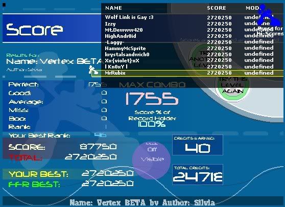 I know! That's what I said! Then I looked at the highscores. 1 Skyta 1,427,550 2 MrRubix 1,427,550 3 cetaka 1,427,550 4 darkshark 1,427,550 5 -Laggy- 1,427,255 6 dragon head 1,427,255 7 gnr61 1,427,000 8 Loot You 1,426,980 9 rman91 1,426,960 10 AOD_ELEMENT 1,426,725 11 Izzy 1,426,705 12 samtorx 1,426,665 13 HammyMcSquirrel 1,426,450 14 Fantasticone 1,426,450 15 XPYRYMYNT 1,426,175 Skyta apparently AAA'ed Reality and got 5 goods on Eclipse, but can't pass Song for the Nihonjins without 100+ misses. Also quite sure that dragon head is BS... but everyone else there is better than me so it's normal.