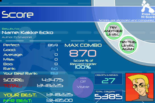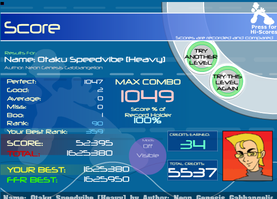 Second run but I don't like playing songs lots as long as I get significantly better score than the last. ![]() Gr. ![]() Gr #2![]() Speedvibe Get: First run ![]() New song?! Lets play! Otaku Speedvibe [Heavy] 1,047 - 2 - 0 - 0 - 1 1,049 1,625,380 Otaku Speedvibe [Heavy] 2 - 3 - 1 - 4 - 21 4 ![]() Ok, I won't lie. I did play this a few months ago when someone challenged me it. Was pretty happy with the score I got after my first legit run post unlock (First one was a either slip up miss/boo/or good. Don't remember). First "cool" VC AAA. ![]() Old AAA; reposted for mega skill update post. My first VC AAA; which I had got about 2 weeks ago. ![]() Aghaghghghghg. Didnt expect this score, but I wish it was an AAA. Would have been even more cool. ![]() First run and tottaly unexpected. ![]() Last edited by Sir_Thomas; 06-4-2008 at 04:21 PM.. |