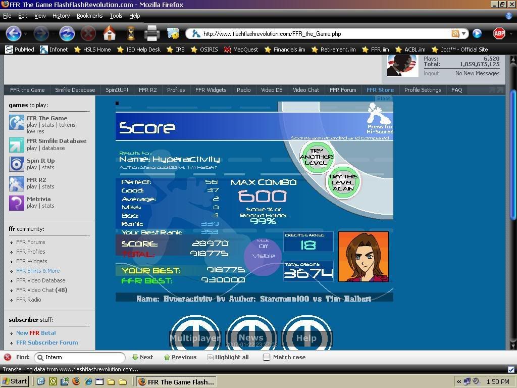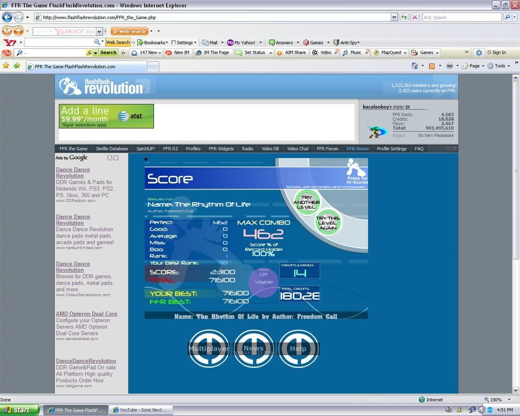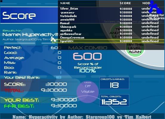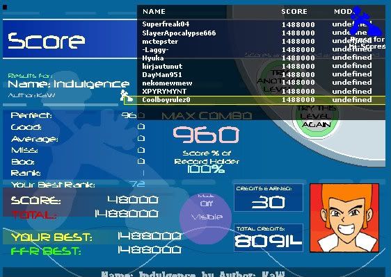 ![]() Well I think this score isn't have bad for being played low res low q. First time trying FFR like that. Stupid vista. Could easily improve it a lot when I get on my XP computer, but I doubt I'll need to