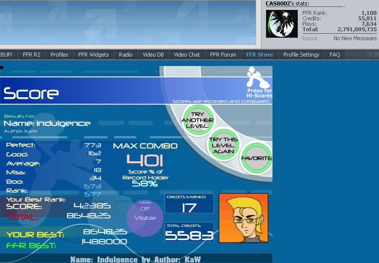 Highest Combo-3330 (Full Combo Blue Army)[10/12][Level 67] Highest Score-5,103,380 (Blue Army) Highest Level AAA-Heroes On Your Lawn At Night [9/12][Level 53] Highest Level FC-Choprite [11/12][70] (1796c) Highest Level Clear-Undici [13/12][Level 110] AAAs-509 (445+64) Tier Points-151 Very Challenging Full Combos-89+ Overall Average Rank Before AvMissFix-556 (AAA:126)(FC:367) Standard Difficulty AAAs-57+ Tricky Difficulty AAAs-74+ Difficult AAAs-107+ Very Difficult AAAs-48+ Steppingest AAA-1442 (Bicycle Break)[7/12] |