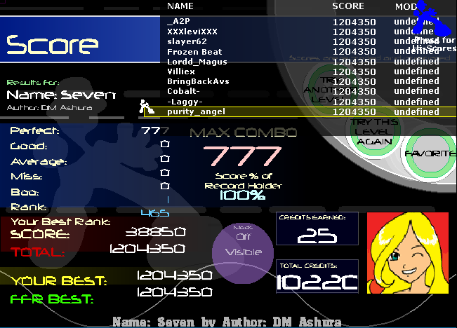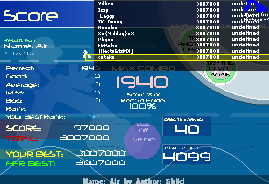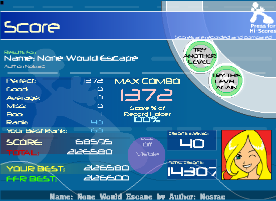 Then I decided to whore this. Originally had 3, then I got 2, and then I figured I would whore the beginning until I AAA'd past the first 80 notes because I can constantly get through the rest of the song with 2 or less goods. Ended up with the AAA, finally. ![]() |